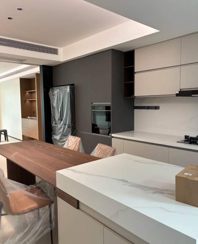 The cabinets were made by a carpenter, and the sintered stone was purchased online; the total cost was less than 10,000 RMB.